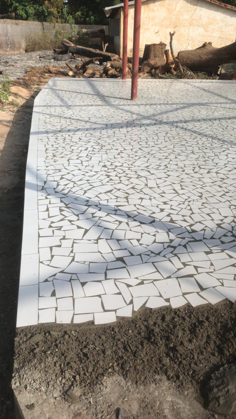 On demande au menuisier d’acier de venir avec tout le matériel des fenêtres afin de travailler sur place. Les maçons ont congé depuis mardi car ils attendent que les fenêtres soit prêtes. Alors que certains d’entre nous travaillent sur les fenêtres, d’autres s’affairent à terminer de découper tous les morceaux de grillages qui iront dans les briques ajourées. Romuald, quant à lui, commence à esquisser le logo du PRÉCI 2020 sur le mur du côté gauche de l’école. C’est d’ailleurs lui-même qui avait créé ce logo qui se retrouve à l’arrière de nos chandails. Les carreleurs ont presque tout fini la surface! Aujord’hui, ils font la surface des escaliers et du trottoir avant. Ils ont travaillés jusqu’à 22h et même 23h plusieurs soirs afin de terminer à temps! On salue grandement leur dévouement au projet. En ce qui concerne la toiture, les soudeurs travaillent fort également pour terminer la courbe de la pergola qui est la partie la plus difficile à faire.