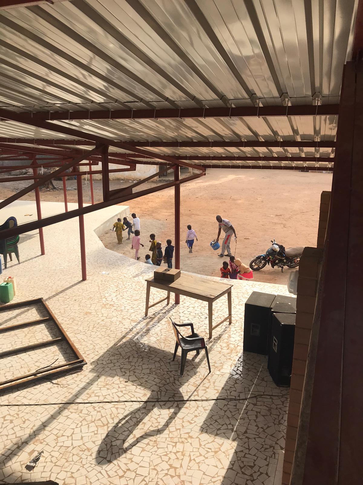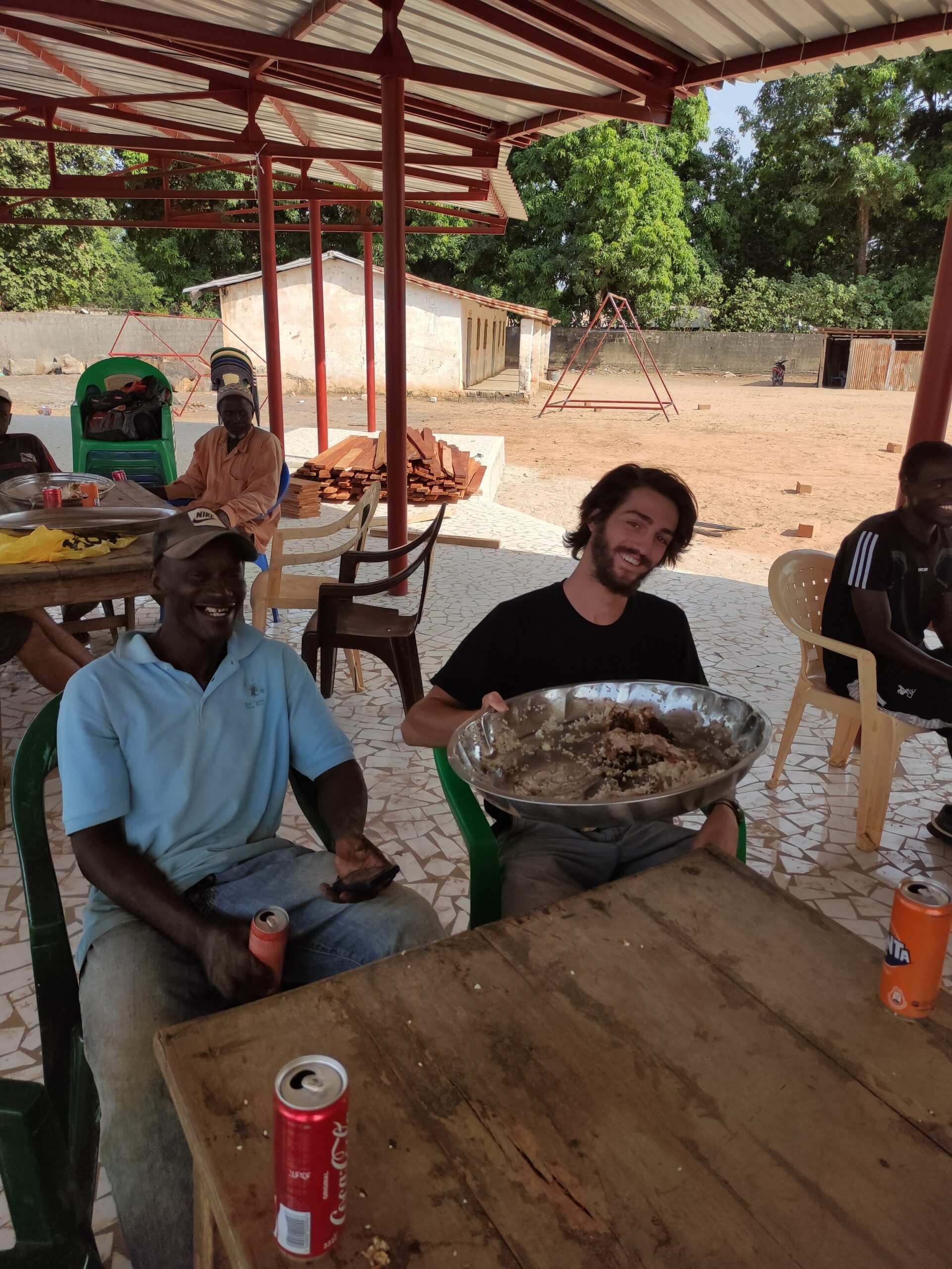 Vendredi, les maçons viennent pour crépir la section de la poutre de chaînage au-dessus des fenêtres ainsi que les jonctions avec le mur. Ils en profitent en même temps pour faire des rampes d’accès aux plus vieilles salles de classe de l’école. Les jeunes soudeurs installent les cadres des panneaux sur les fermes de toit alors que les soudeurs de toit repartent finalement pour Ziguinchor. On fait préparer un grand repas de « fin de chantier » avec tous les travailleurs afin de les remercier de leur implication tout au long du projet. On essaye de terminer le plus rapidement possible alors que notre départ approche à grands pas, et on reste encore jusqu’à 1h du matin pour poser des panneaux de bois sur les fenêtres.